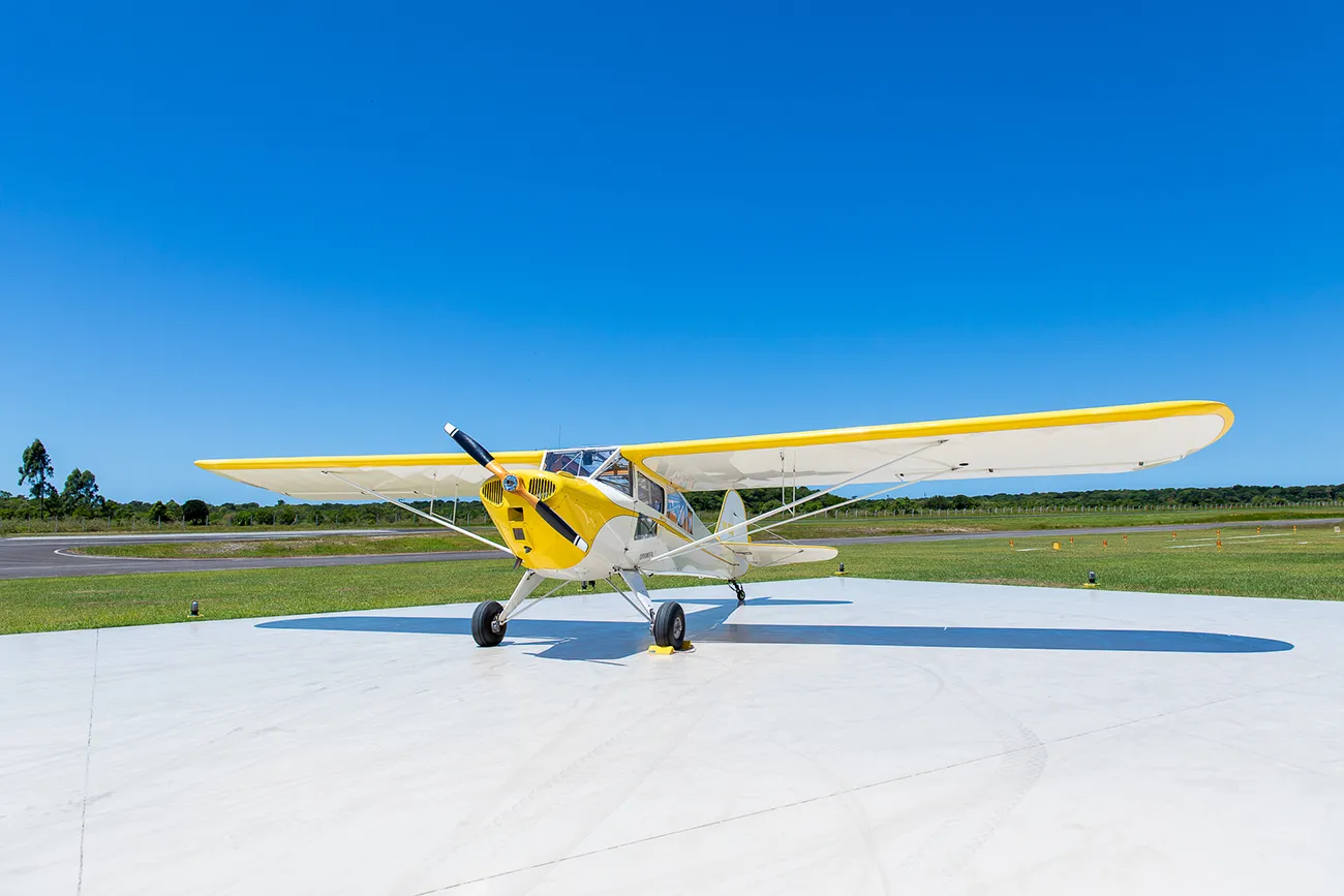 A aeronave do acervo tem uma história que pode ser reconstruída apenas à partir da sua aquisição pelo piloto, entusiasta de aviação e arquiteto José Luiz S. Perez, pois o aparelho foi por este encontrado e adquirido quando estava em Ubá (MG), já sem quaisquer condições de voo, em estado lastimável e sem registro ativo junto às autoridades. Foi necessário que fosse totalmente reconstruído, e recertificado, daí o seu registro na ANAC (Agência Nacional de Aviação Civil) ser apenas à partir dessa reconstrução, e por este mesmo motivo, o aparelho constar como sendo de fabricação do próprio José Luiz S. Perez, com número de fabricação “01”, e do modelo “Aust Campeiro”. Segundo explicação do próprio Perez sobre esta designação de “modelo”, tratou-se de uma liberdade histórica aeronáutica, com fins legais, pois como o registro na ANAC exigia a definição de um “modelo” próprio, que não podia ser o de uma aeronave de produção em série (o que era o caso do exemplar em sua origem, um Taylorcraft BC-12D), foi criado por ele este modelo “Aust Campeiro” – que unia o “Aust” em referência ao Auster fabricado pela subsidiária da Taylorcraft no Reino Unido, sobretudo durante a Segunda Guerra Mundial, com o “Campeiro”, que era uma homenagem do proprietário ao Neiva XL-10 Campeiro, uma versão do Paulistinha desenvolvida no início dos anos 60, até estágio de protótipo, pela Indústria Aeronáutica Neiva, para a Força Aérea Brasileira, possuindo motor Avco Lycoming, de 150hp. A reconstrução foi acompanhada e atestada, para fins da recertificação, pelo Engenheiro Aeronáutico Reuel de Matos Oliveira, e foi feita nas oficinas de restauro do então Museu da TAM, em São Carlos (SP).